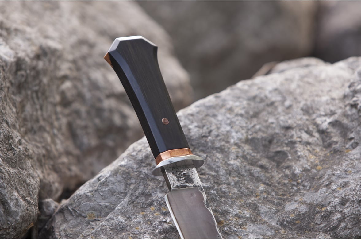 Handle: Faceted 1095 guard, copper spacer and Ebony